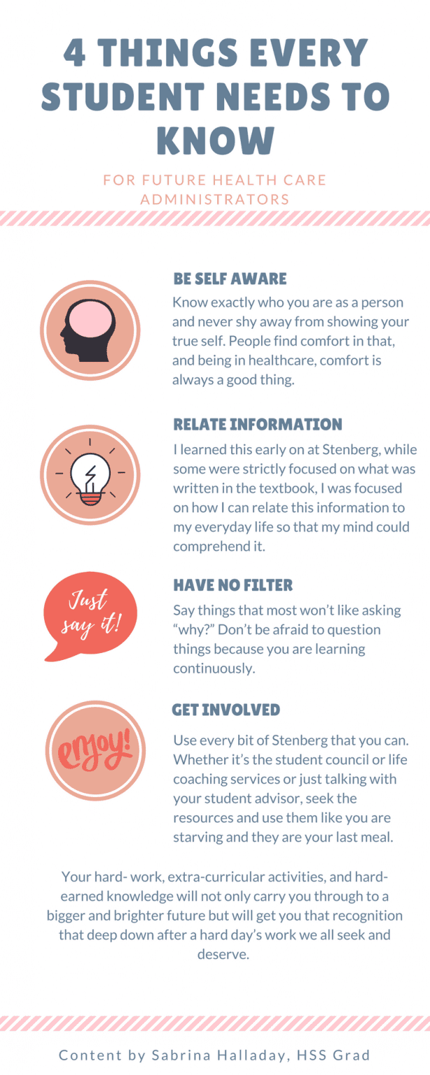 At the end of the day when all is said and done, and you have paid your loans, done your time at school and received your hard-earned diploma, you need to sit back and appreciate that you did everything you could to make your time at Stenberg the best and most constructive experience possible. Remember you are only going to get out as much as you put in. I, Sabrina Halladay, Hospital Support Specialist, Valedictorian with academic distinction, guarantee that if you put in 150% you will get that exact amount back from Stenberg.